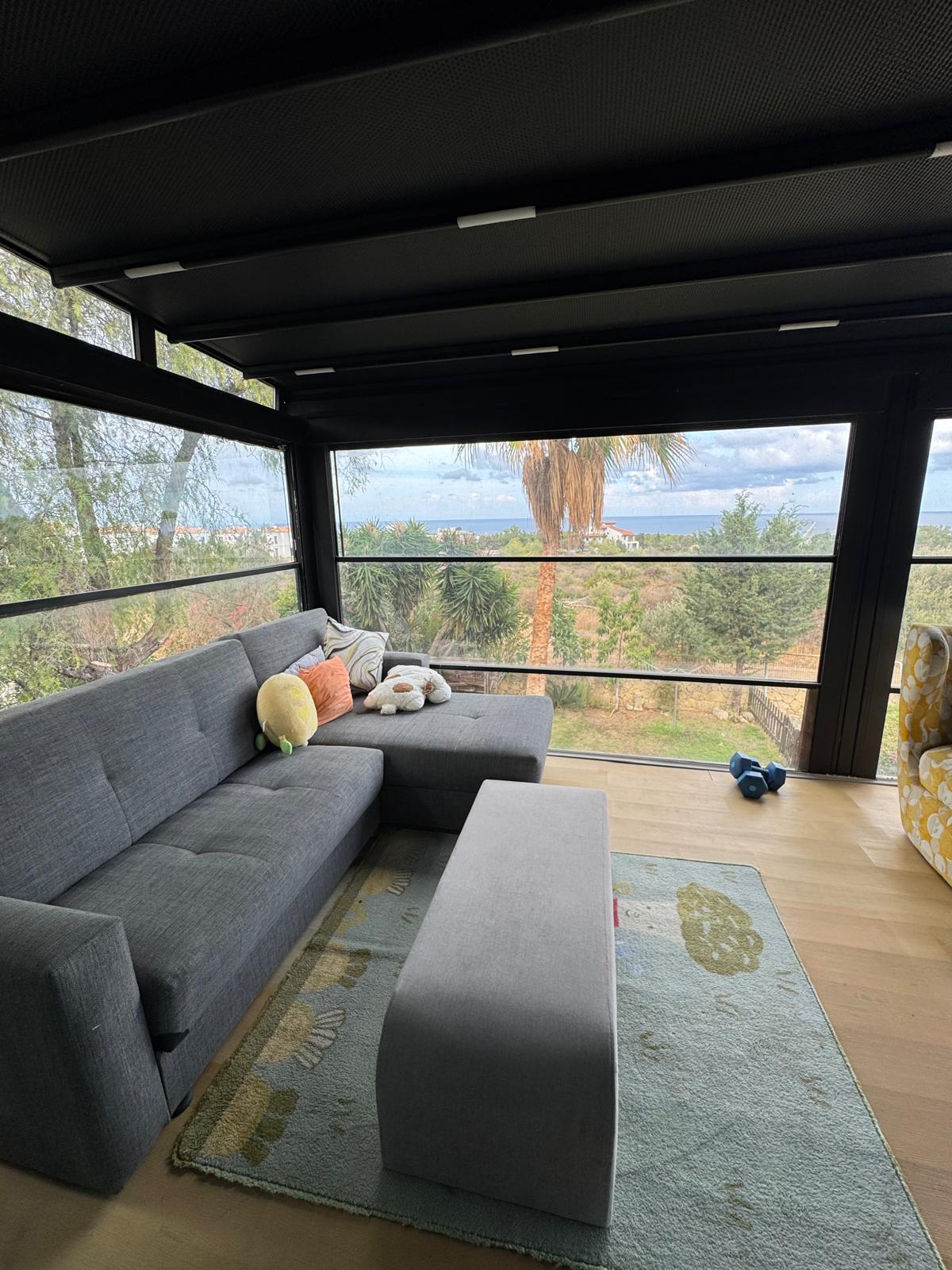 Taş kaplam 180 m2 büyüklüğünde 3 yatak odalı müstakil villa zemin katında giriş holü, misafir WC, salon, mutfak, yemek odası bölümü ve üstü açılır kapanır camlık. Birinci katında 1 ebeveyn Duş /WC li Yatak odası olmak üzere toplam 3 Yatak odası, 1 aile banyosu ve 1 adet kesilmez deniz manzaralı üzeri açılır kapanır hobi/oyun odası…